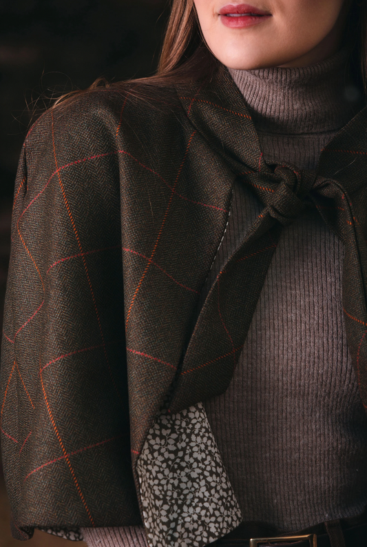 Classic Check Lovat Tweed Tie Neck Cape lined with Liberty Fabric by LoullyMakes