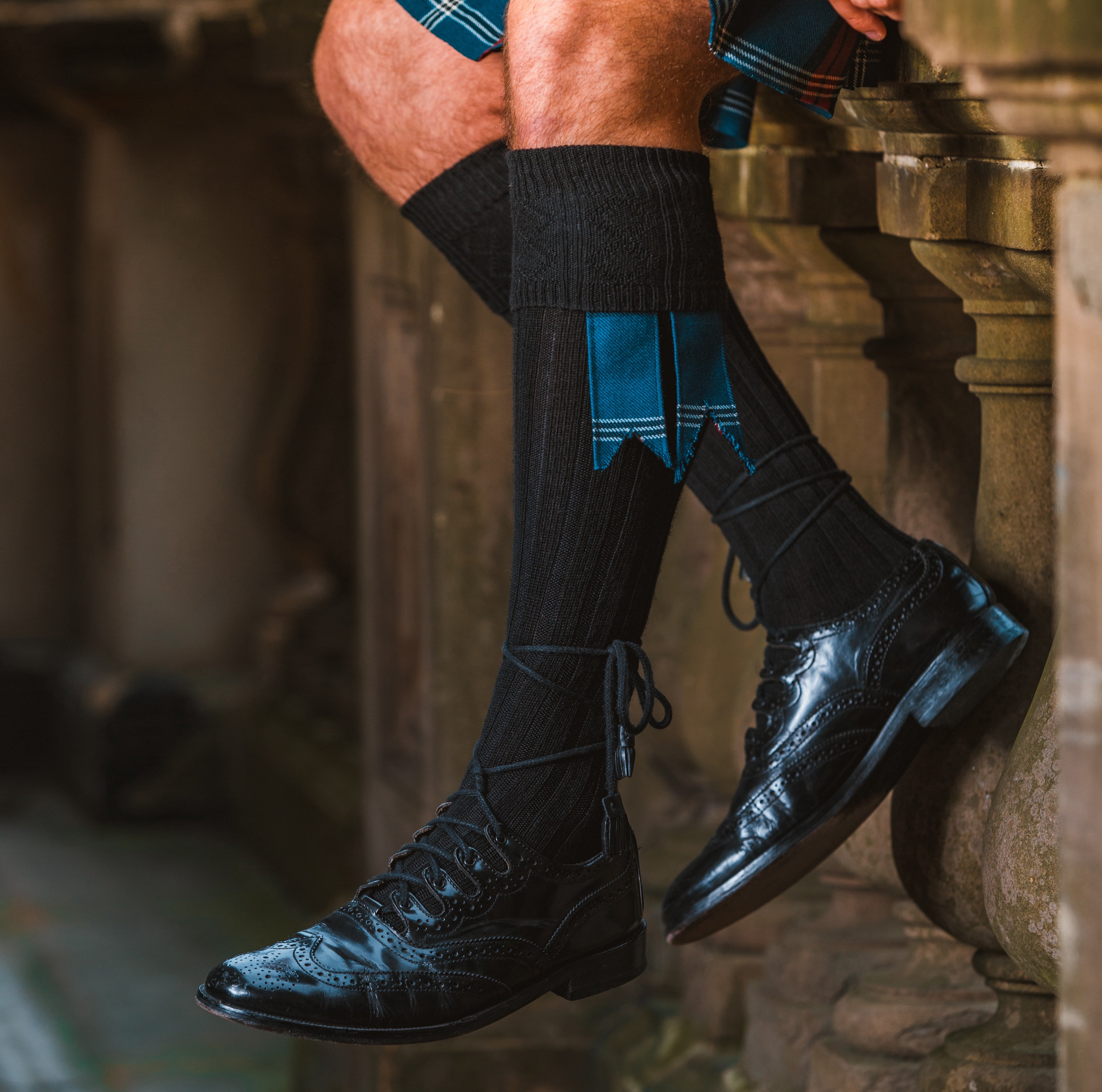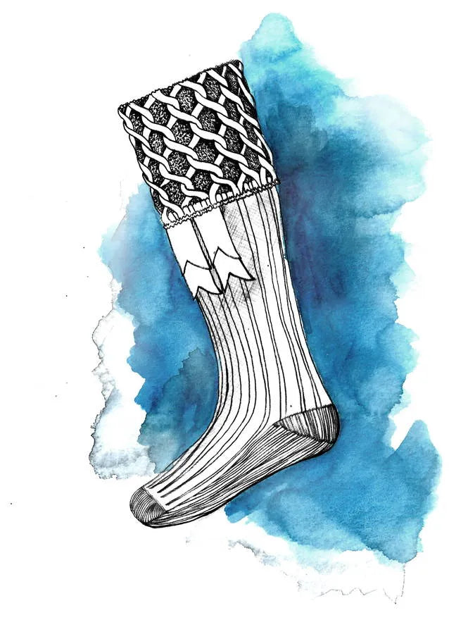 Traditional kilt hose were woven to match your tartan (a simplified version called an ‘Argyle’ pattern) or had diced (checked) tops for the regiments. Today, we favour plain colours in intricately-knitted wool blends.