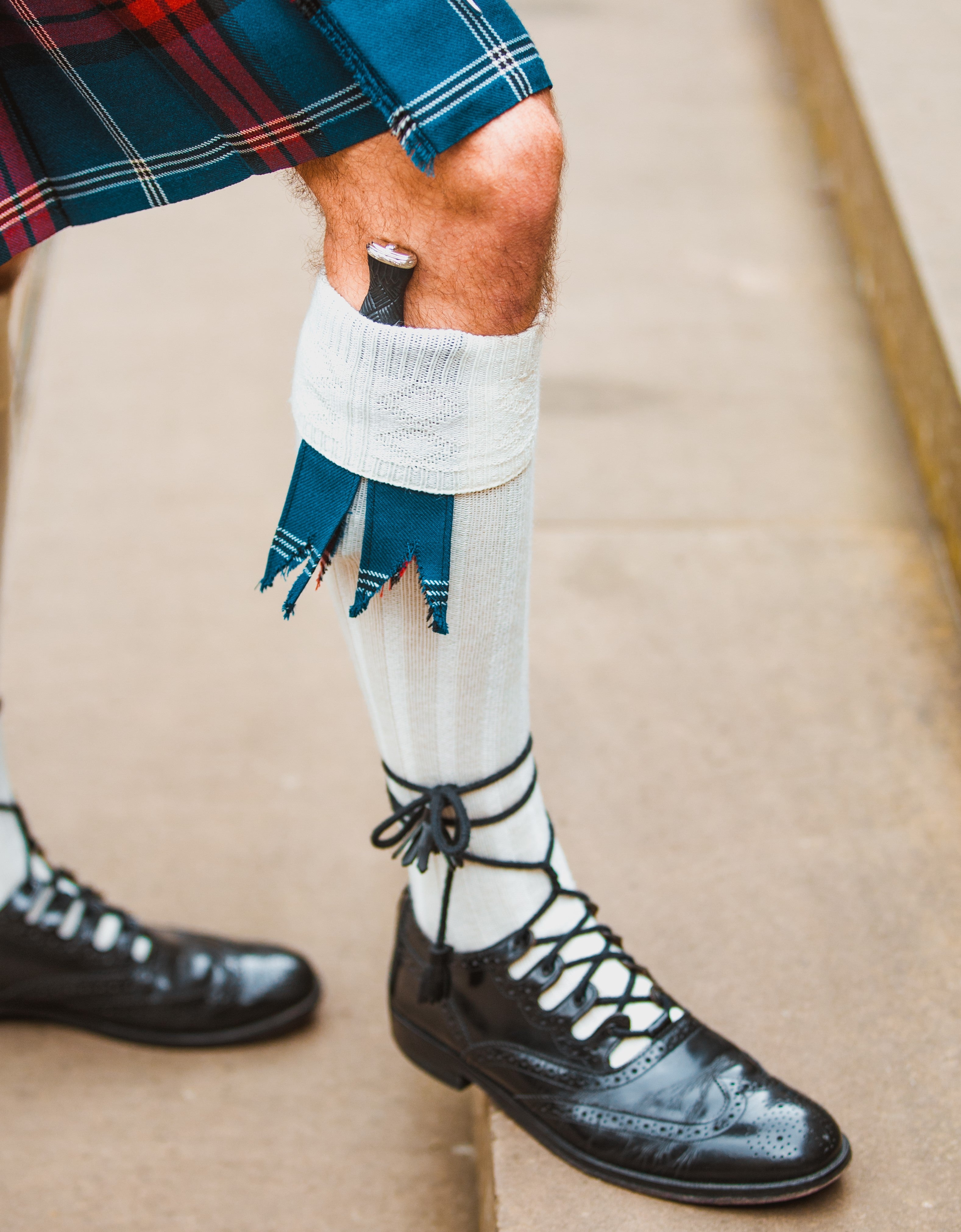 You can now complete your look with your sgian dubh! Make sure to tuck this inside the sock on the side of your writing hand, running down the outside of the leg. Only about an inch of the top of the sgian dubh is left visible above the top of the sock.