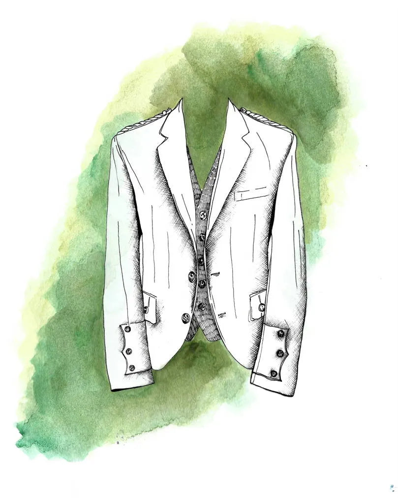 Made from the same 15oz heavy-worsted black barathea as the Prince Charlie, the Argyll is cut like a blazer with just one fastening. A curved cutaway at the front helps show your kilt and sporran off to full advantage. Like the Prince Charlie, it has ornate diamond-shaped buttons and silk-braided epaulettes. What it lacks in tails, it makes up for with button-accented scalloped pocket flaps. While classic Argylls feature heavy-duty gauntlet cuffs, we favour the Prince Charlie cuff. They’re a little easier to alter and a lot more contemporary looking.