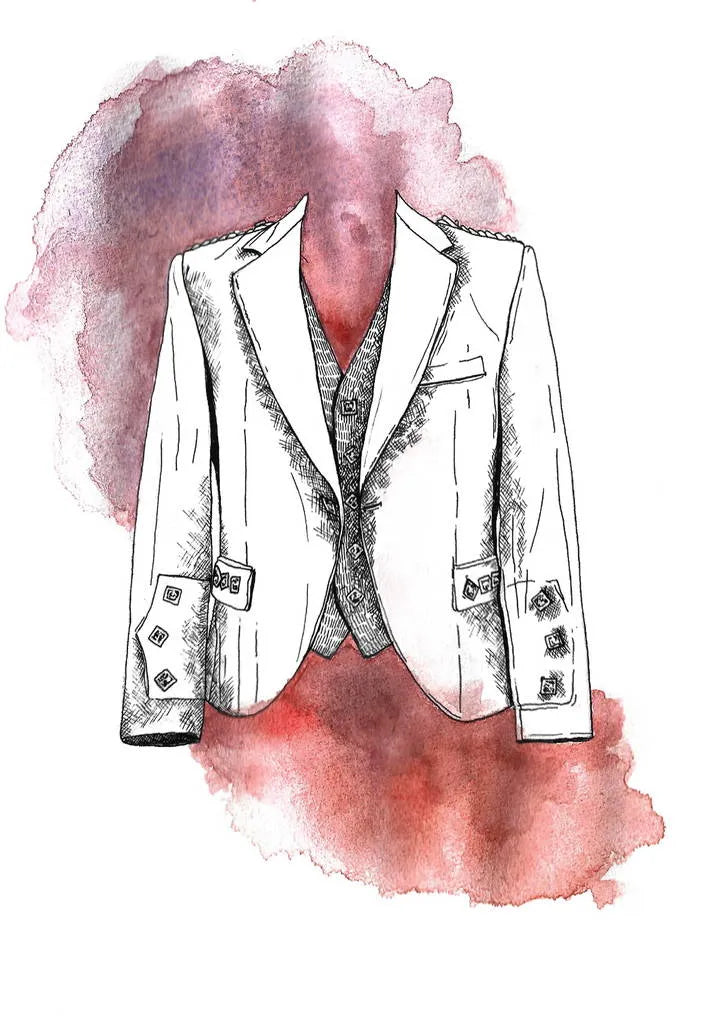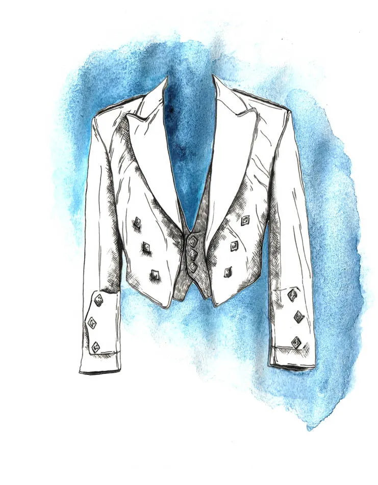 Made from a heavy-worsted black wool cloth known as barathea, the Prince Charlie is an elaborate affair, rich in period detail. Distinctive for its tails, it is both shorter (at the front) and longer (at the back) than any other kilt jacket. It features ornate diamond-shaped buttons on the front, sleeves, shoulders and tails, as well as satin lapels and silk braided epaulettes. Its three-buttoned vertical scalloped cuff is also known as the Prince Charlie.