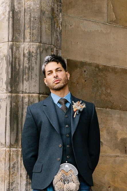 Made exclusively to our very own GNK specifications, the Tweed comes in three luminous fabrics: Lovat Green, Midnight Ocean and the Nicolson Tweed. Woven in Hawick by Lovat Mills, each cloth is full of different colours and has amazing depth. The jacket is cut away to show off your kilt and sporran, with two staghorn-effect buttons at the front and more on the sleeves. It comes with a matching five-buttoned satin-backed waistcoat.