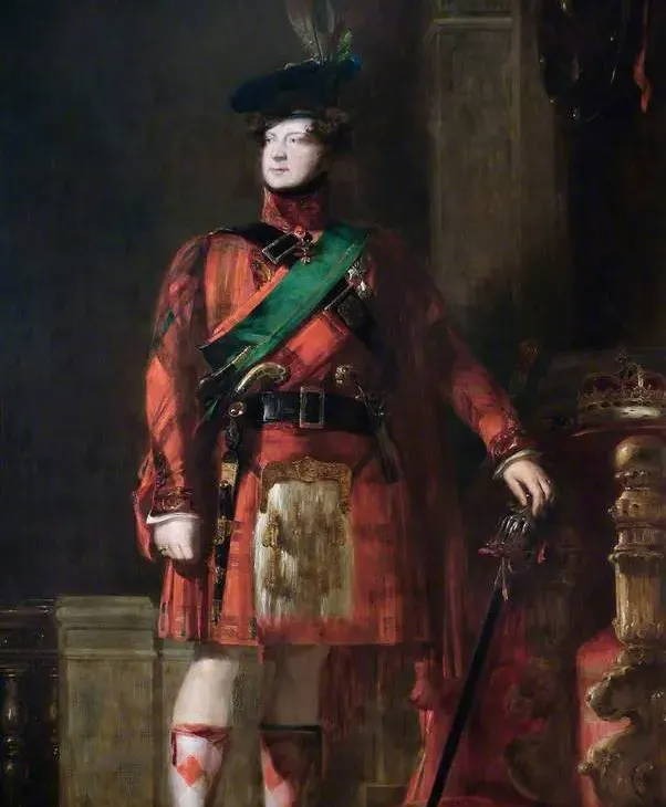 Scott was tasked with orchestrating the visit of King George IV to Edinburgh in August 1822 - the first Hanoverian monarch to ever visit this part of his nation and the first monarch at all to visit since 1633, the Coronation of Charles I. This visit was a celebration of great importance, Scotland was being brought back into the fold of the United Kingdom. It was a display of the finest tartans - weavers Wilson's of Bannockburn were producing tartan, tartan that had never been seen before using dye stuff that wasn't available pre The Dress Act of 1746. They were vibrant, exciting and based on Clan. Chief's were invited to choose a sett they liked or perhaps develop a fragment that had survived proscription. George IV himself adorned himself a complete highland garb in an outfit worth anywhere between £10,000 to closer to £1million according to different sources, in today's money. He was ridiculed by some and the gesture appreciated by others - Scot's not best known for being able to agree on anything.