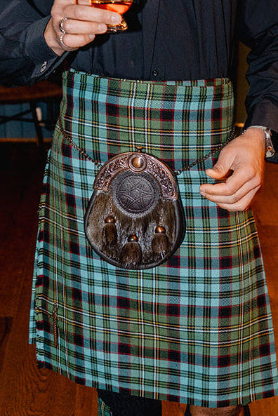 Sporrans are pockets. Pockets for kilts. Because kilts don’t have pockets. You see? They serve as a wallet and a container for any other necessary personal items. Lighter, hip flask, lucky Lego man - feel free to get creative. Unlike pockets, however, sporrans sit at the front. Over what we delicately refer to as your groin, area or, erm, bits. Sporrans today are typically worn on a chain, although older styles may hang from a leather strap or kilt belt.