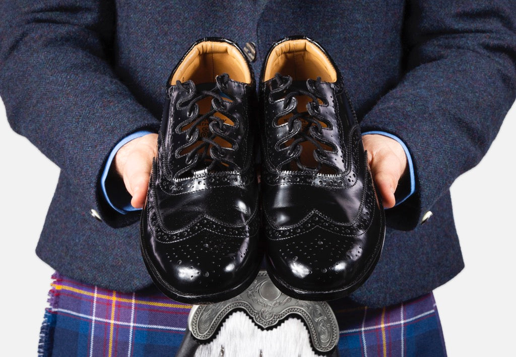 The most traditional form of Scottish footwear, the black Ghillie is mandatory for black tie occasions, worn with cream or black hose and an Argyll or Prince Charlie.