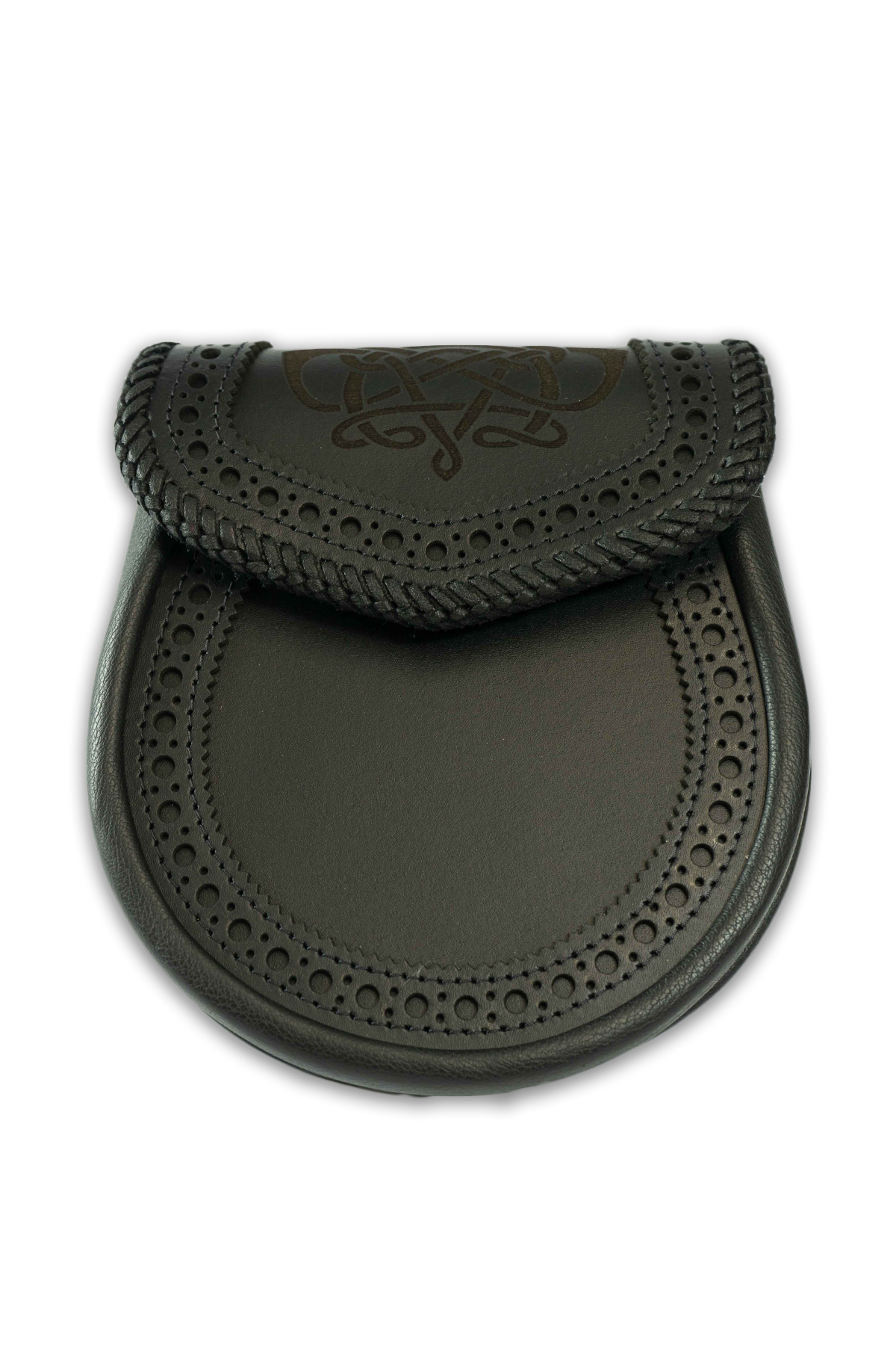 A sturdy handmade leather day sporran with Celtic engraving and an intricate hand-bound edge.