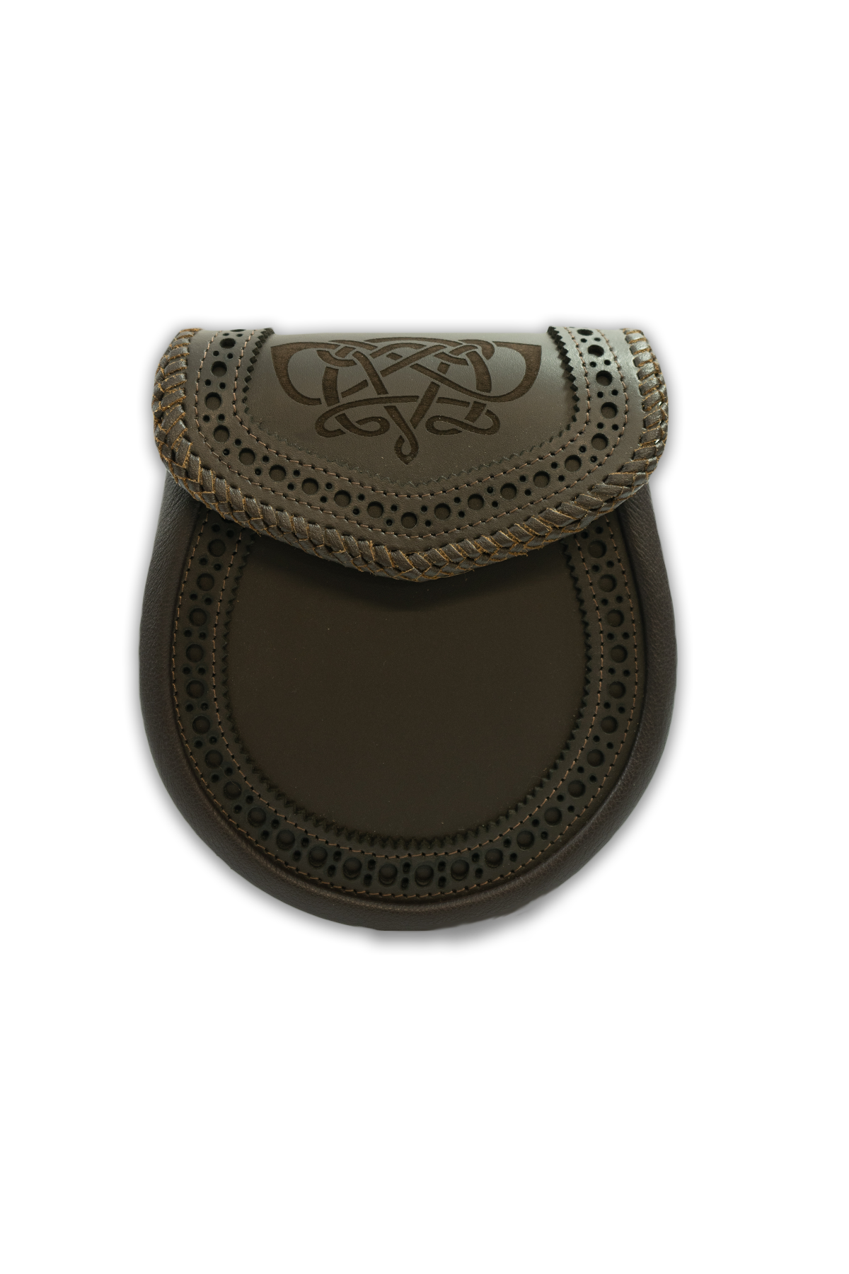 A sturdy handmade leather day sporran with Celtic engraving and an intricate hand-bound edge.