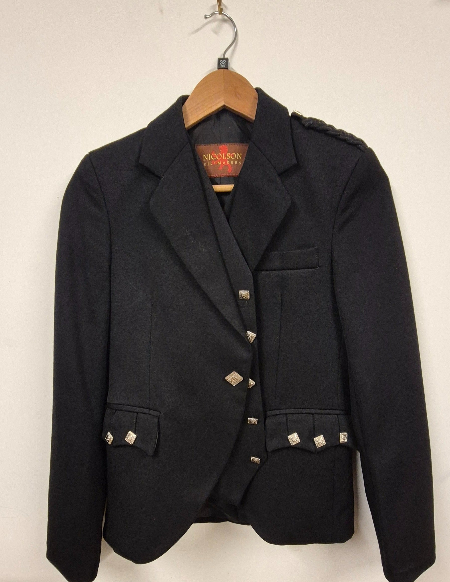 Ex-Hire KIDS Argyll Jacket and waistcoat. The Argyll is cut like a blazer with just 1-button fastening. A curved cutaway at the front shows your kilt and sporran off to full advantage. It has ornate diamond-shaped buttons, braided epaulettes, scalloped pocket flaps, plain cuff. 5-button Waistcoat