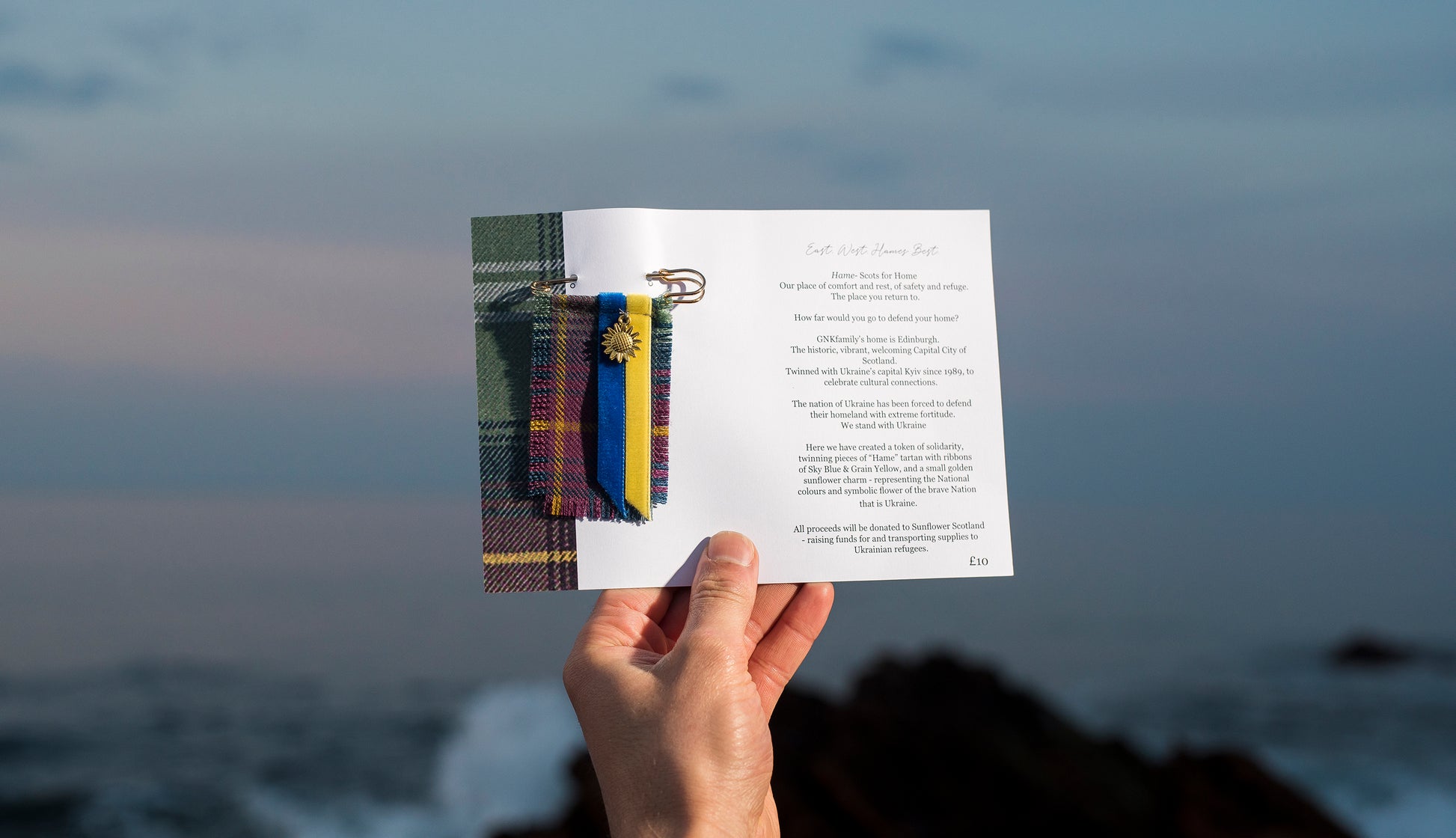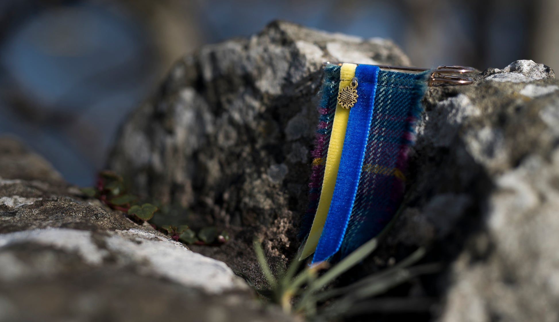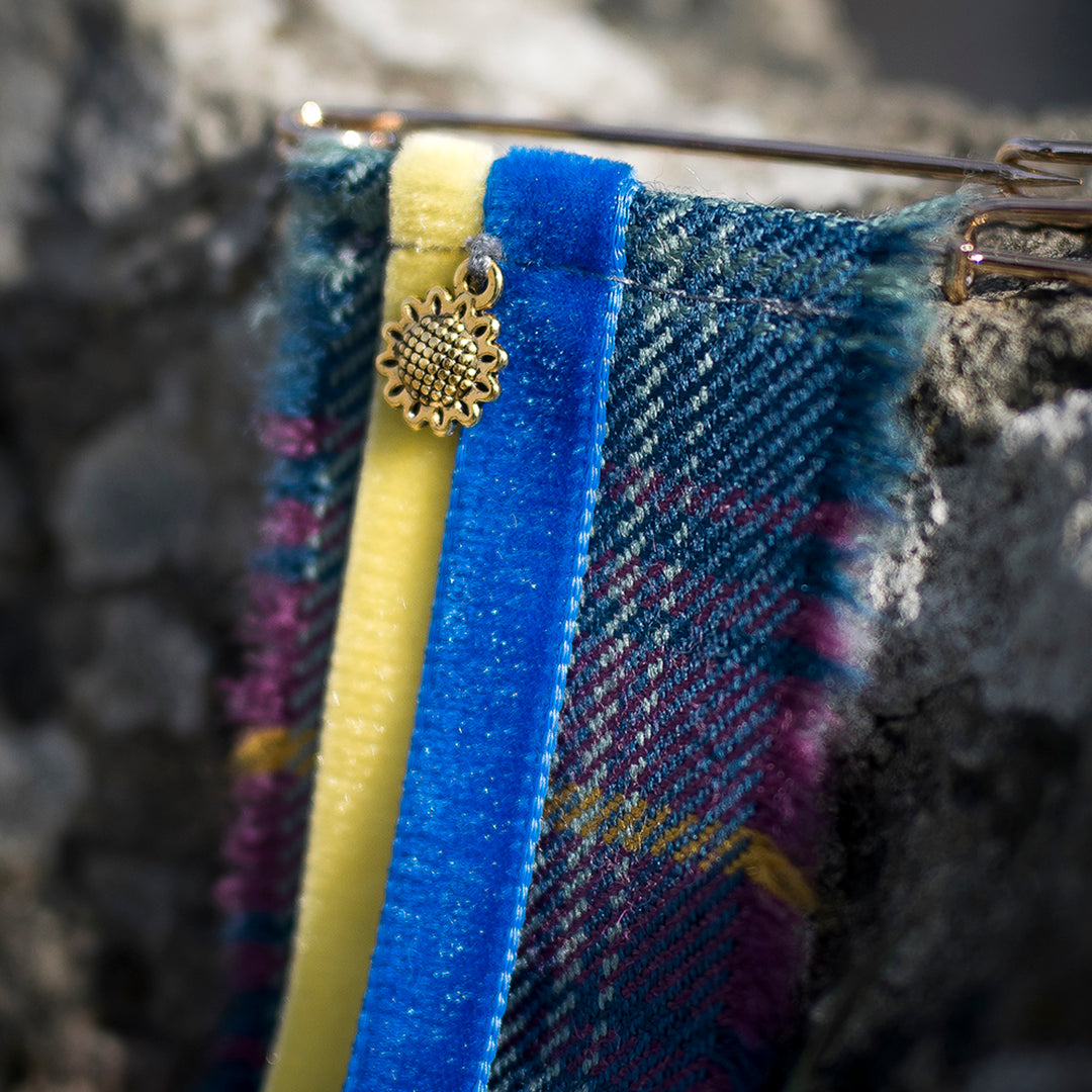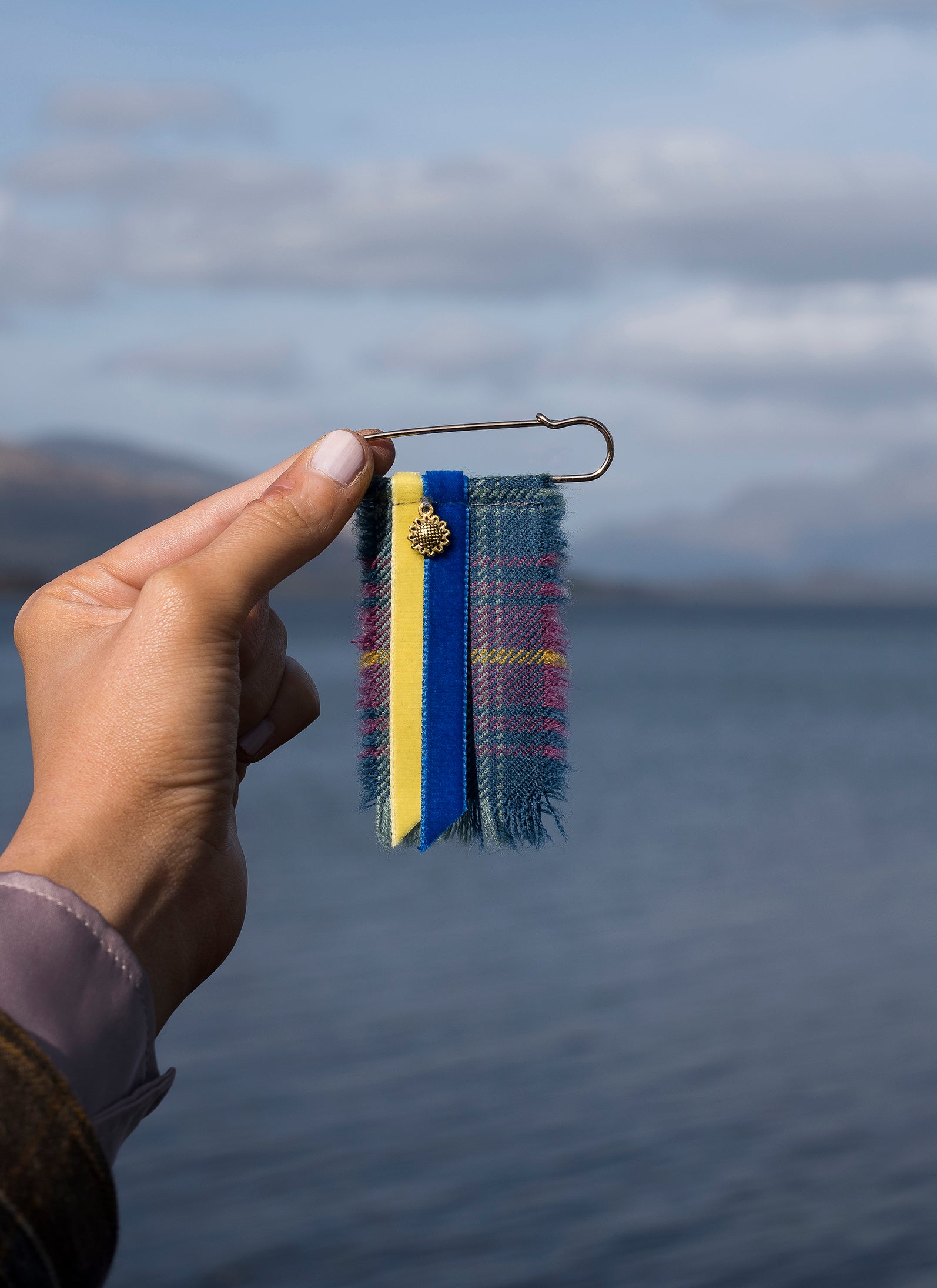 Here we have created a token of solidarity, twinning pieces of “Hame” tartan with ribbons of Sky Blue & Grain Yellow, and a small golden sunflower charm - representing the National colours and symbolic flower of the brave Nation that is Ukraine.
