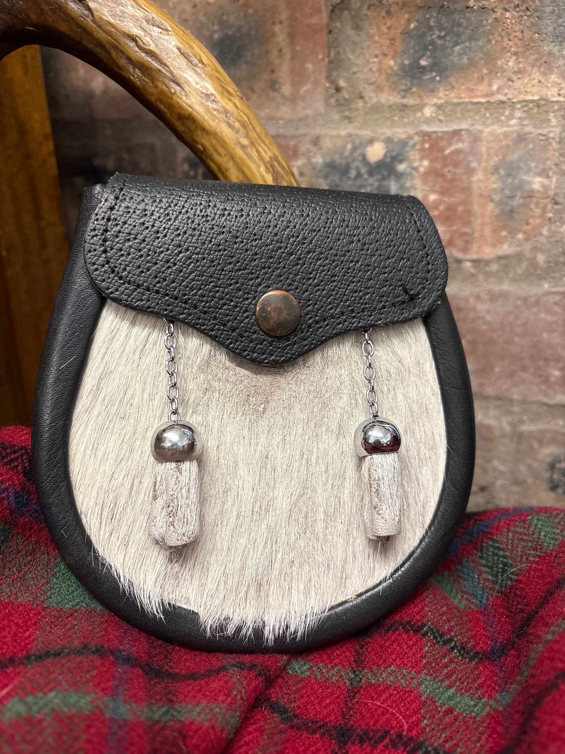 A handmade dress sporran with an intricately-worked leather (Pictured with leather top and light seal pelt).