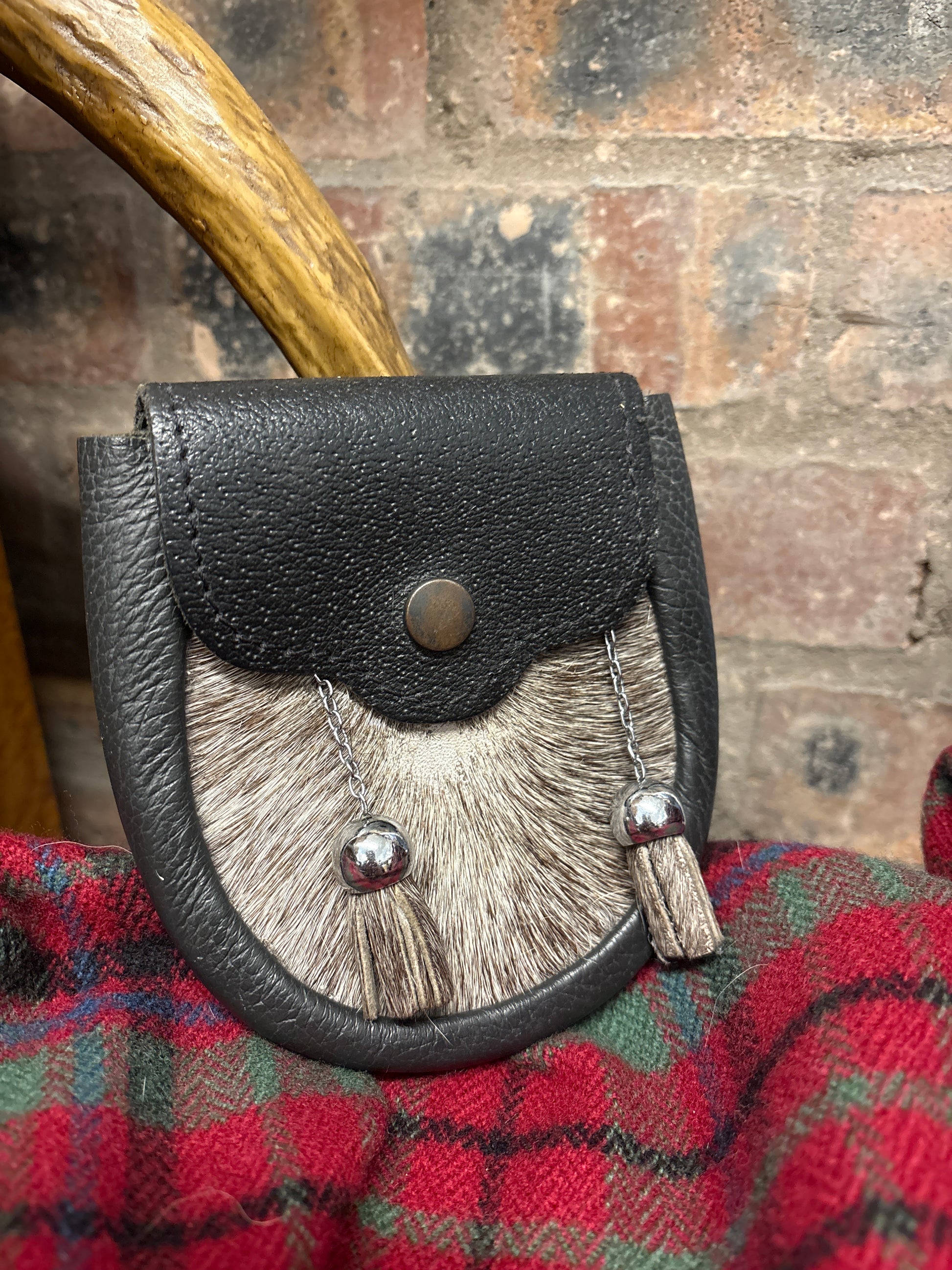 A handmade dress sporran with an intricately-worked leather (Pictured with leather top and mid seal pelt).