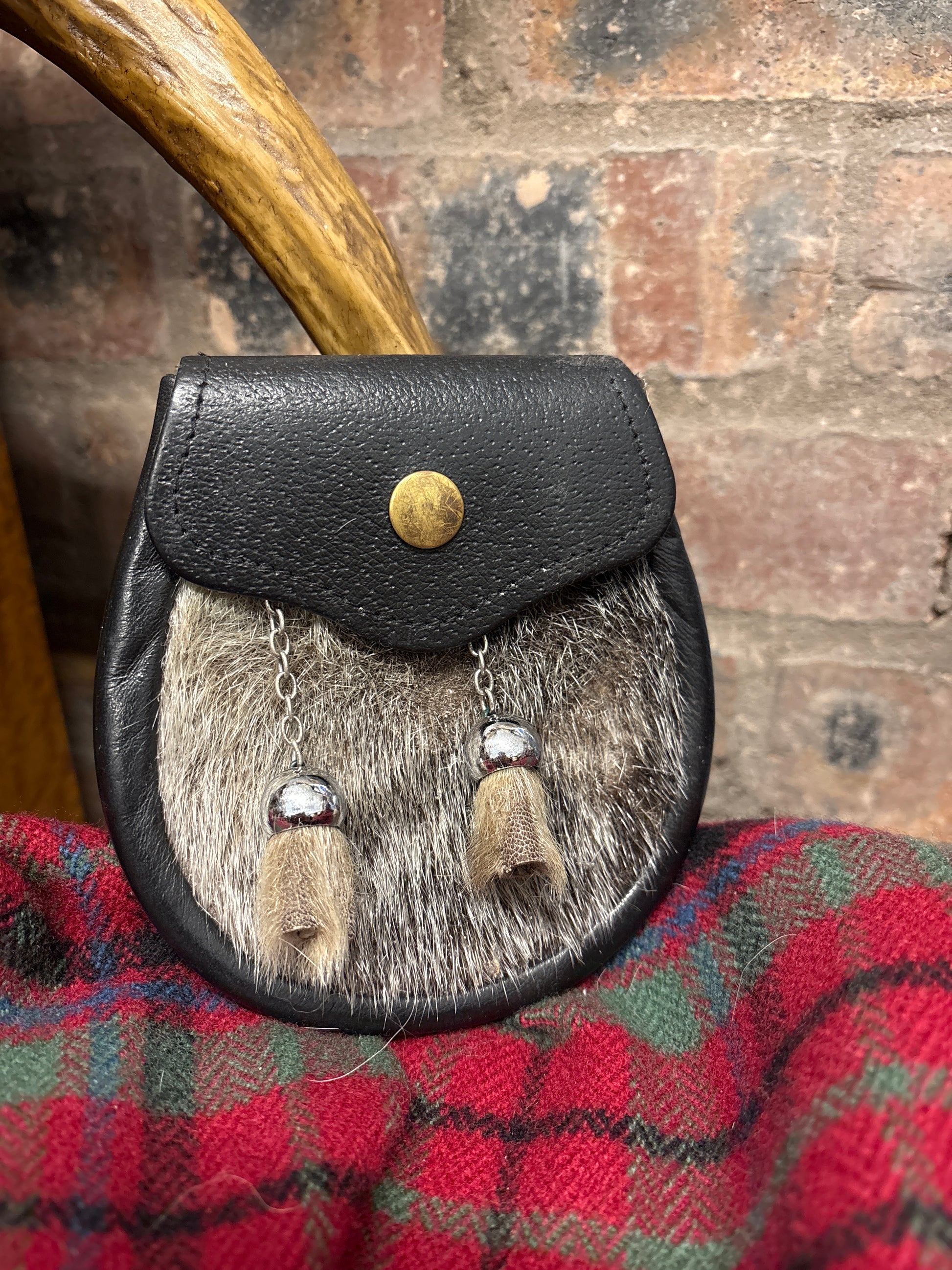 A handmade dress sporran with an intricately-worked leather (Pictured with leather top and mid seal pelt).