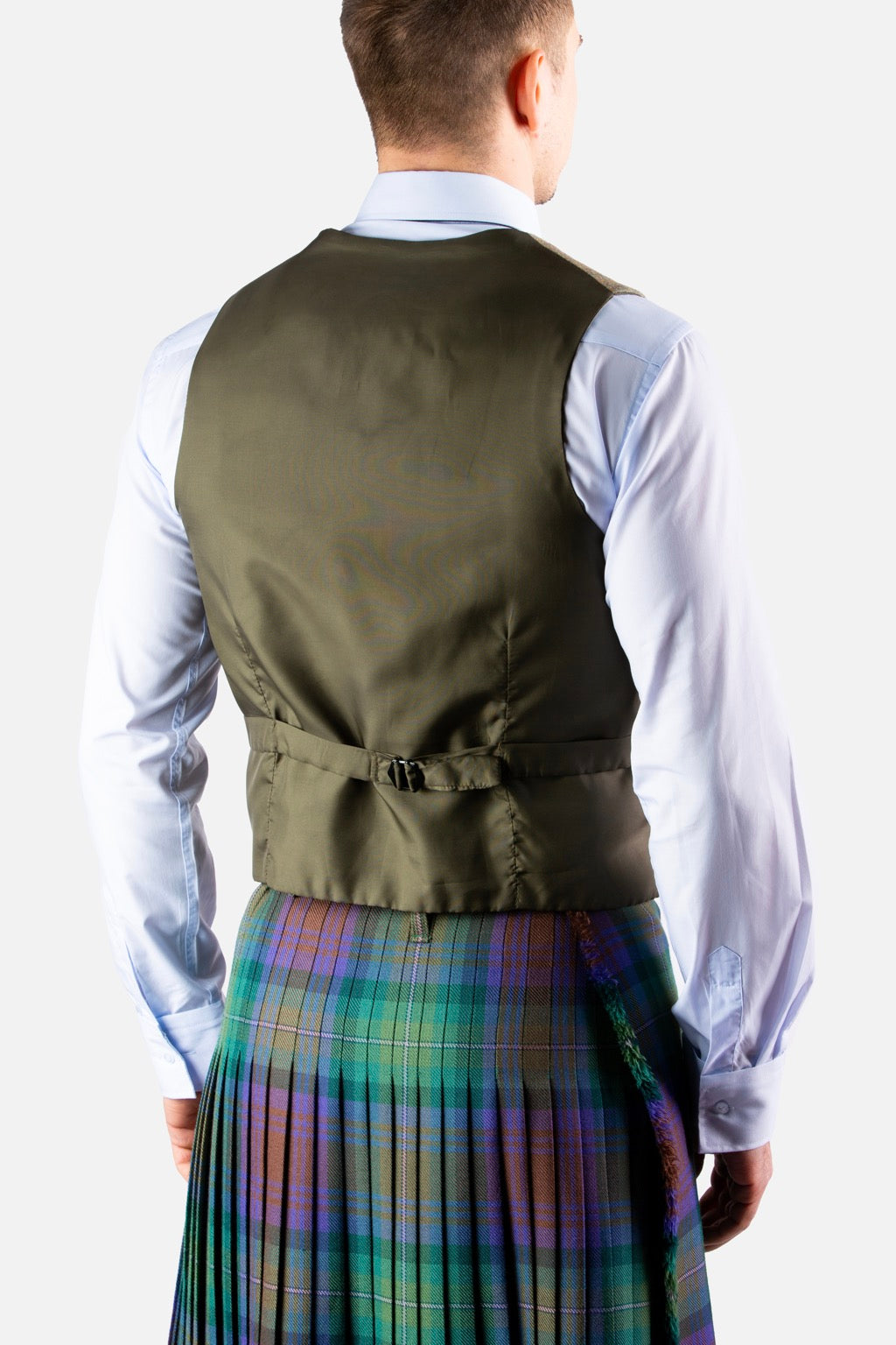 Made from tweed woven in Hawick by Lovat Mills, this luxurious kilt jacket is cut away to show off your kilt and sporran, with two staghorn-effect buttons at the front and more on the sleeves. It comes with a matching five-buttoned satin-backed waistcoat.