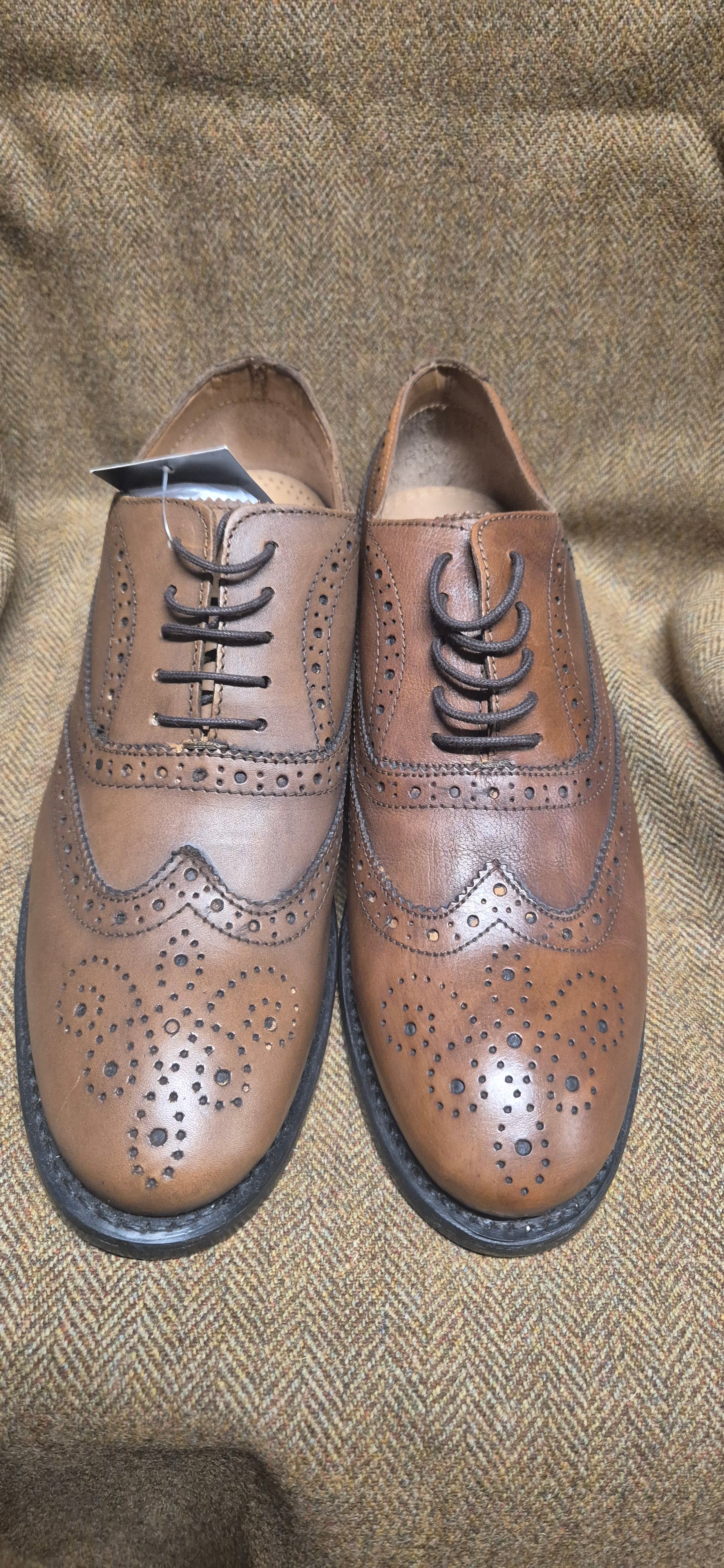 SALE THISTLE BROGUE Classic Oxford day brogue, suitable for any occasion. Made using Goodyear welted construction - the quality of the welt and finished lock stitch can be clearly seen. The calf leather upper has a matt finish. Leather lining allows the foot to breathe, and a padded leather insole provides comfort. Camel Brown.